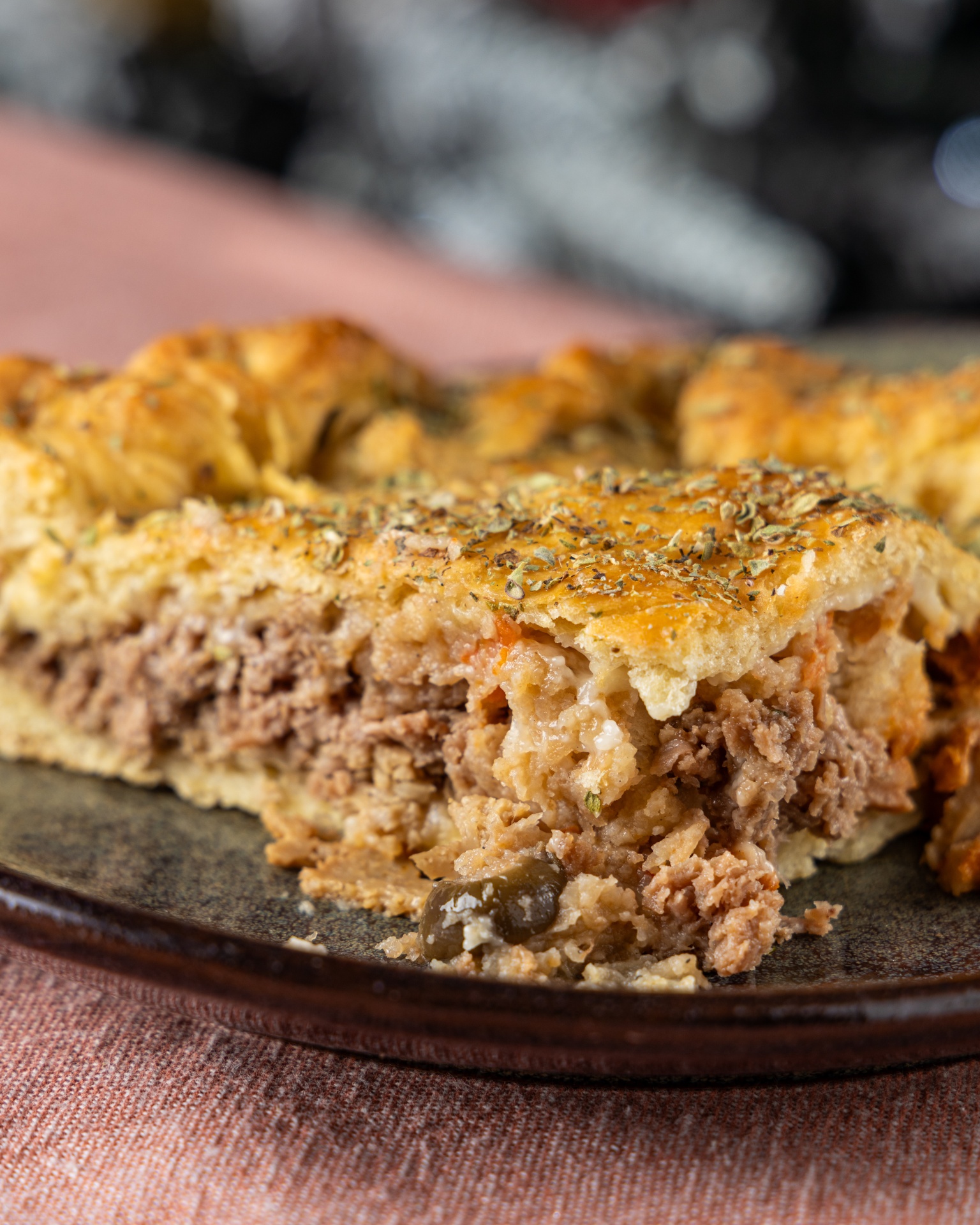 Ingredientes: Farinha de TRIGO, açúcar, emulsionante (E481), aroma, água, sal, margarina (óleo de palma de origem* e derivados, óleo de girassol, óleo de soja, água, sal, emulsionantes (mono-digleciridos e lecitina de SOJA),aromas, corante: B-caroteno, anti-oxidante: extrato natural rico em tecoferois e palmitato de ascorbilo e ácido cítrico) e levedura. Recheio: Enchido de Soja [(granulado de SOJA, farinha de TRIGO, massa de pimentão (pimentos e sal marinho), Tofu (SOJA, água, nigari-cloreto de magnésio natural), azeite, vinho mesa tinto (SULFITO), alho, pimenta branca e especiarias)], Seitan Natural [ farinha de TRIGO, água, SHOYO (feijão de SOJA, TRIGO e água), sal marinho, condimentos (alho, sal, azeite, vinagre branco e molho de SOJA), preparado vegetal para derreter [água, amido modificado, gordura vegetal: coco, azeitona, proteína de arroz, sal, fibra vegetal, espessante (goma de tara), corante (carbonato de cálcio), conservante (ácido sórbico), aroma natural vegan, corante (betacaroteno), vitamina B12].